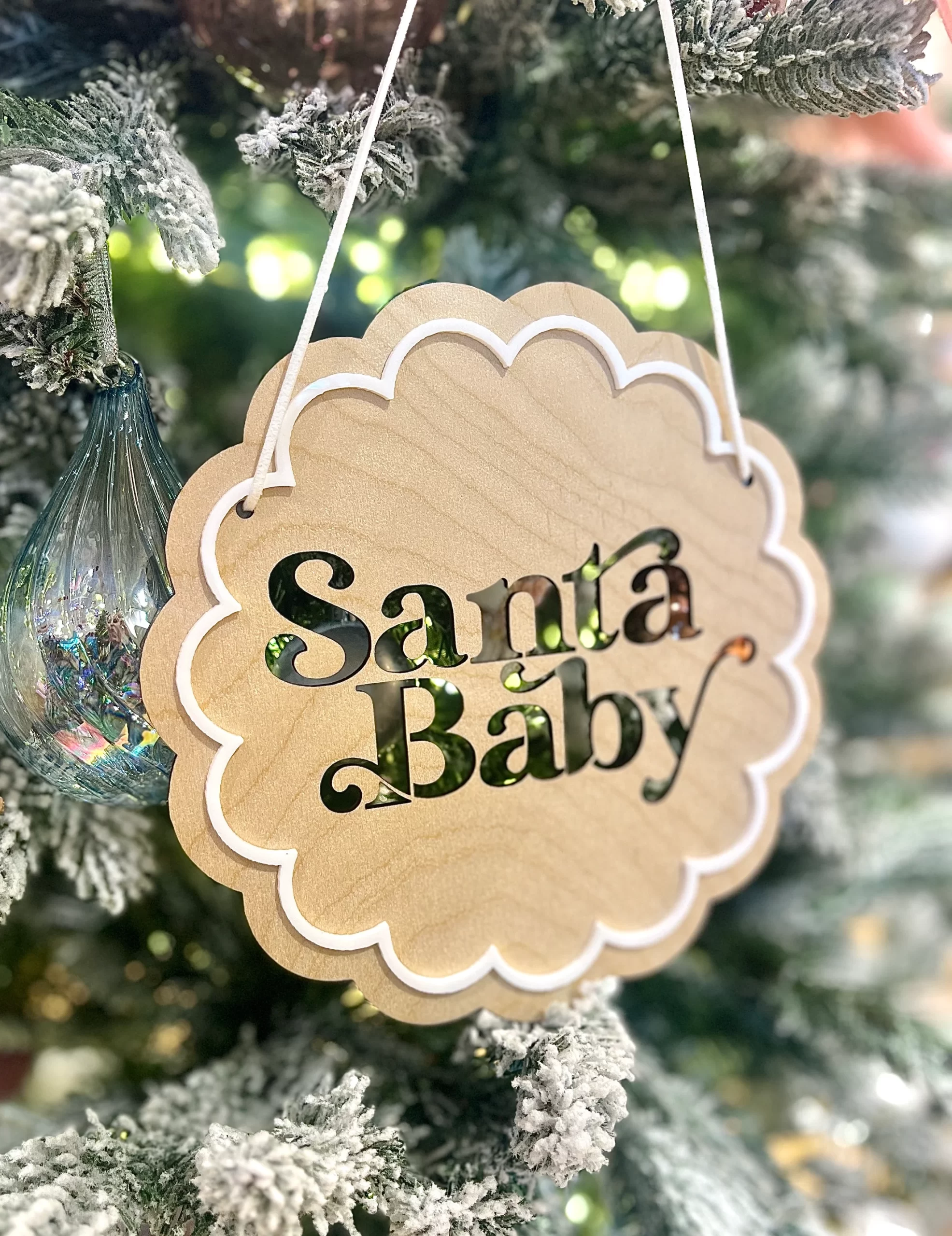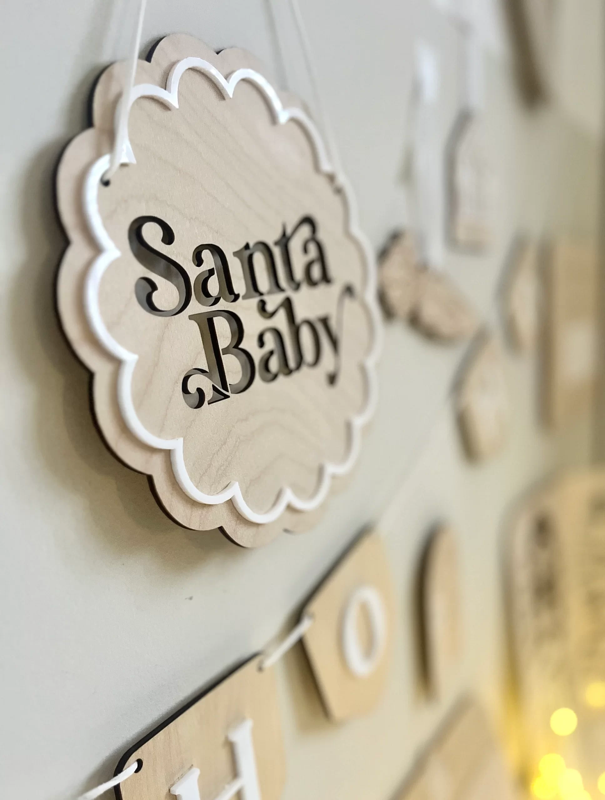 Hang our “Santa Baby” wooden flag this season for a stylish, modern take on Christmas decor. In a scalloped design with cut out text detail, this flag comes with a white trim and a gorgeous white suede cord to hang and move as you desire.